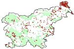 slika1: Karta razširjenosti rogača v Sloveniji (vir: Monitoring populacij izbranih ciljnih vrst hroščev -Nacionalni inštitut za biologijo)