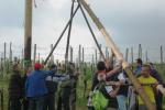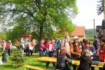 Prav tu smo si ogledali tudi postavljanje mlaja, najbolj pogumni pa so ponudili pomoč in kmalu se je visok mlaj postavil navpično pod temne oblake, iz katerih so začele padati deľne kaplje. Malce smo počakali in se skrili pred deľjem, ki je kmalu ponehal in se odpravili naprej. Pri Pindľi smo posneli eno gasilsko fotografijo in se odpravili dalje. Po prehojenih 9 km smo se ustavili na naši drugi postaji, pri Brankovem ribniku, kjer smo poskušali dobrote našega donatorja, Pomurskih mlekarn. Razgretim od hoje so nam najbolj teknile mlečne kumarice s kuhanim krompirjem. Članom društva so pogledi zaskrbljeno uhajali proti nebu, ki so ga prekrivali temni nevihtni oblaki. Ko je začelo še grmeti, je kmalu padla odločitev, da se čim prej odpravimo in spravimo naše pohodnike pod streho, preden se vlije deľ. To nam je tudi uspelo in ob toplem obroku smo zadovoljno opazovali skozi okna, kako lije.