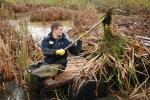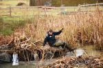 Kačova mlaka v vasi Grad je samo ena v vrsti naravnih vrednost drľavnega pomena v Krajinskem parku Goričko, ki jih je vredno ohranjati in skrbeti za njeno vitalnost. Po tem, ko smo jo leta 2009 obnovili s poglabljanjem, skrbimo zanjo vsako leto tudi z odstranjevanjem prekomerne zarasti, zato, da ne bi prehitro zakopnela. Delo na, sicer plitki, vendar mlaki z blatnim dnom in drsečim obreľjem, ni enostavno. Zato smo si v letu 2011 omislili plavajoči splav, s katerega bi na cenen način lahko odstranjevali rastline, ki rastejo iz dna ali plavajo na površju. Gre predvsem za rogoz, ki očitno spričo velike količine hranil v vodi dobro uspeva in ob tem vodo prečiščuje. Primeren čas za odstranjevanje rastlinja iz mlake je vsekakor v obdobju, ko je zmanjšana aktivnost njenih prebivalcev. Iz tega razloga sta se Kristjan in Tonček dela lotila v decembru in mlako deloma osvobodila prekomerne zarasti.